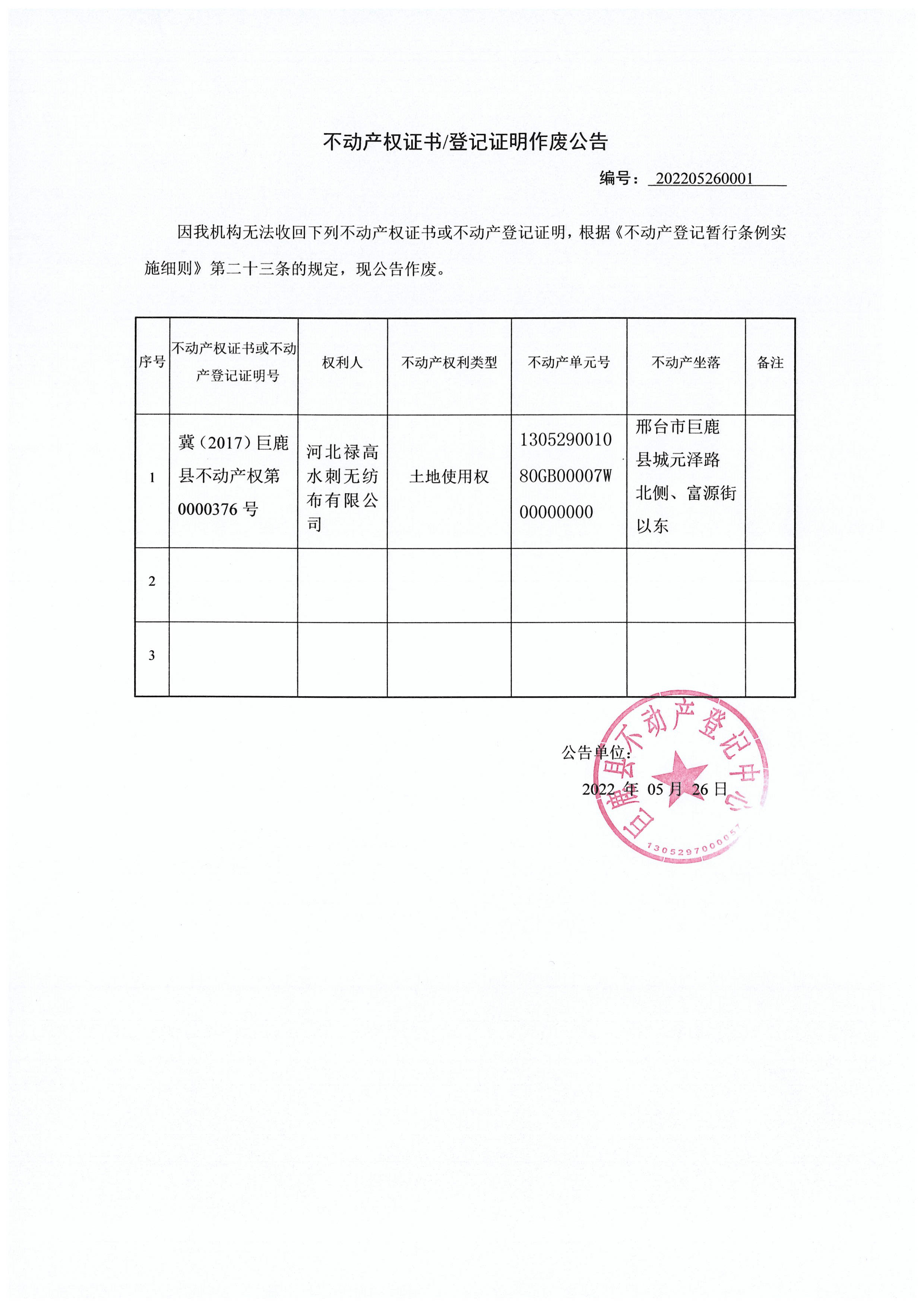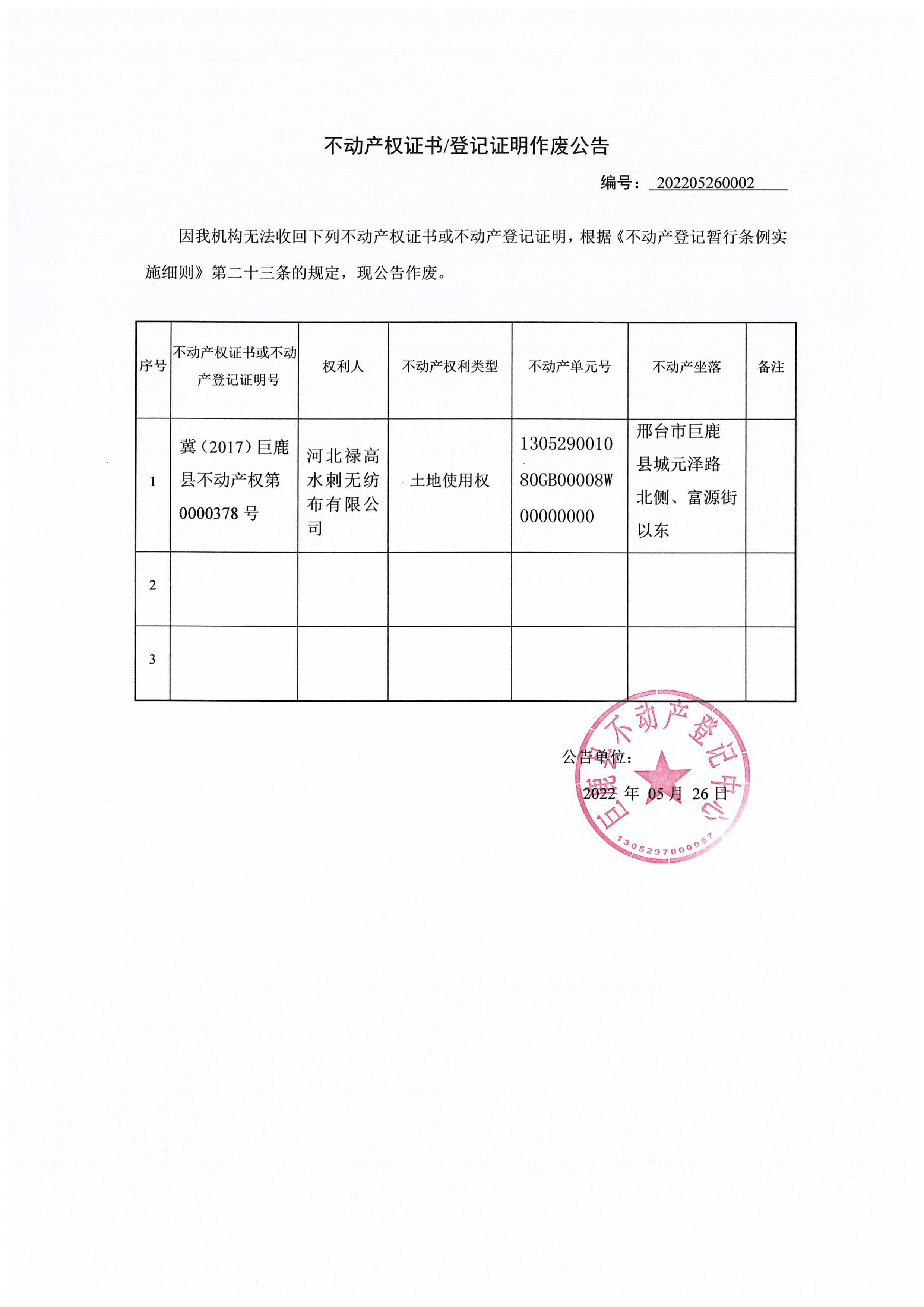河北禄高水刺无纺布有限公司不动产权证书作废公告