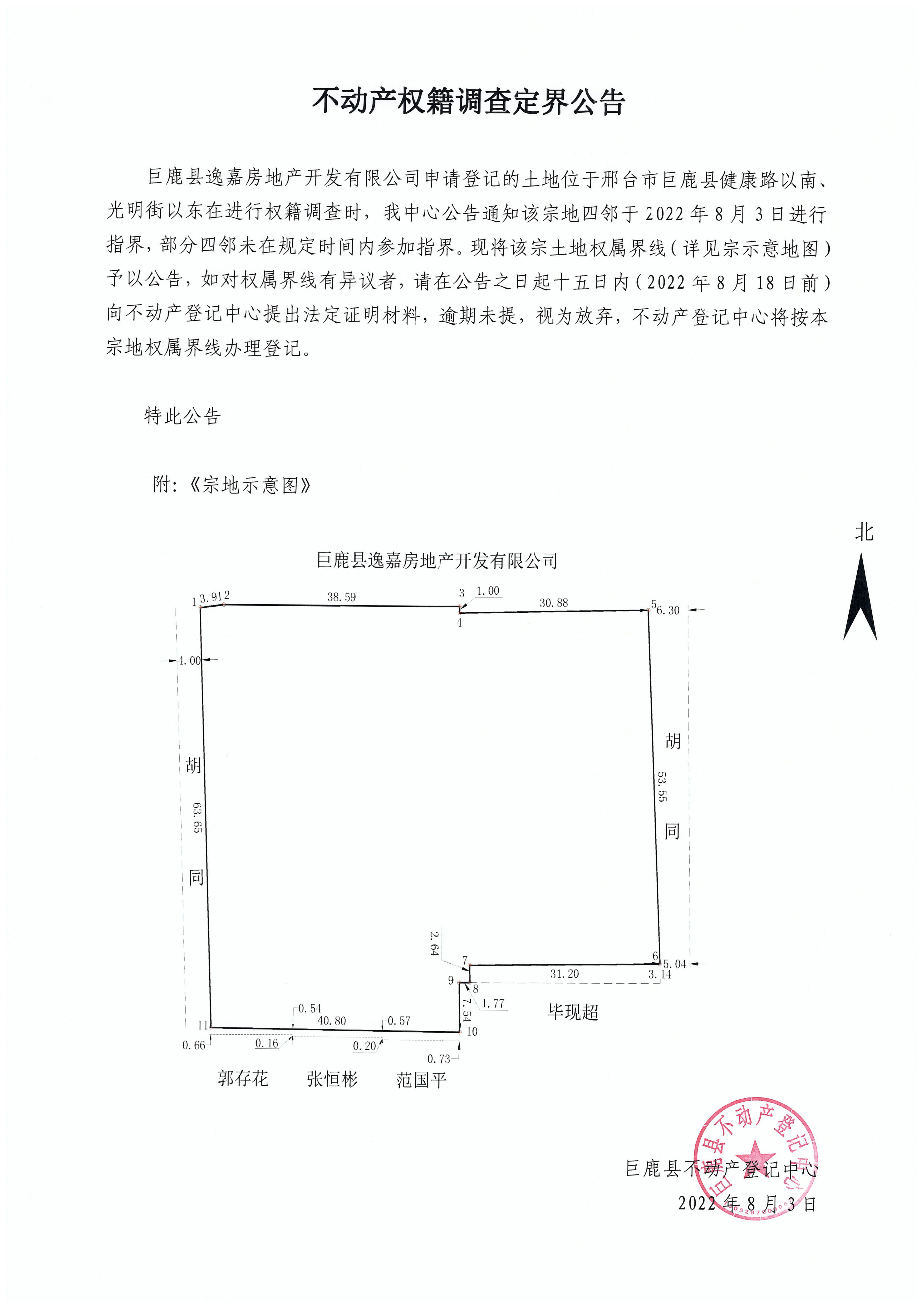 巨鹿县逸嘉房地产开发有限公司不动产权籍调查定界公告