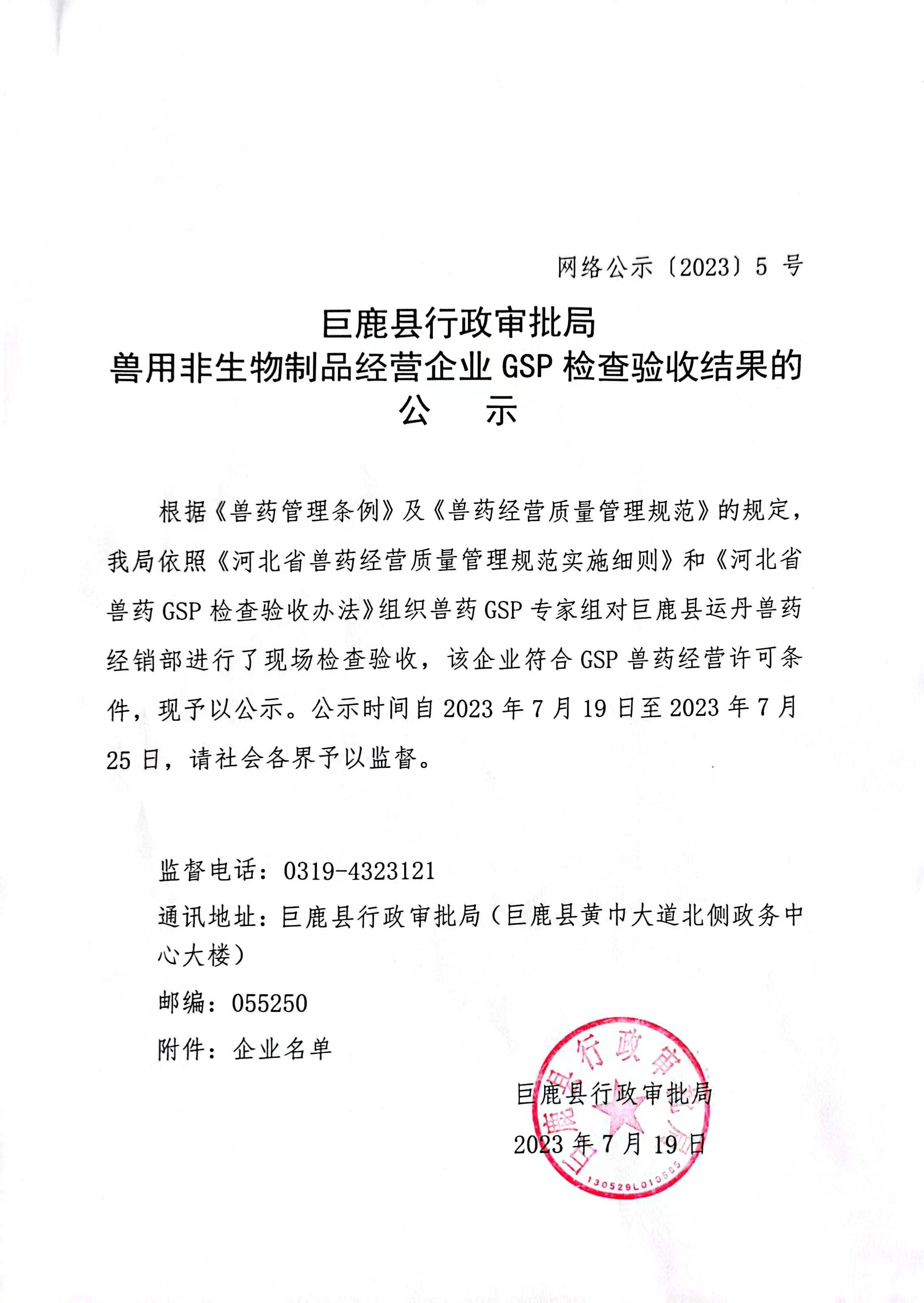 巨鹿县行政审批局兽用非生物制品经营企业GSP检查验收结果的公示.jpg